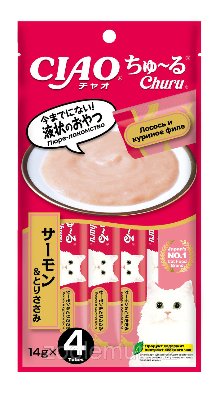 Суперпремиальное пюре-лакомство CIAO Churu (ЧАО ЧУРУ) на основе лосося и нежного филе фермерской курицы от японского производителя Inaba изготовлено исключительно из натуральных ингредиентов и отличается высоким процентом влажности, благодаря чему поддерживается водный баланс организма кошки. Корма и лакомства Inaba отличаются высоким качеством и неповторимым вкусом, ведь они изготавливаются только из отборных традиционных японских ингредиентов! Удобная упаковка позволяет кормить питомца прямо с рук, используя лакомство для поощрения или дрессировки или использовать его как топпинг к сухому или влажному корму. Во все продукты добавлен экстракт зеленого чая, который, благодаря содержанию катехина, нейтрализует неприятные запахи содержимого кишечника. Пюре-лакомство обогащеновитамином Е - натуральным антиоксидантом, поддерживающим иммунную систему, не содержит искусственных добавок, красителей и консервантов.